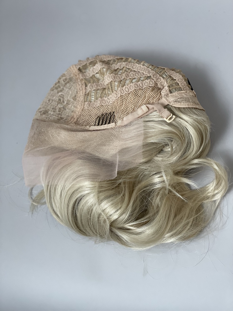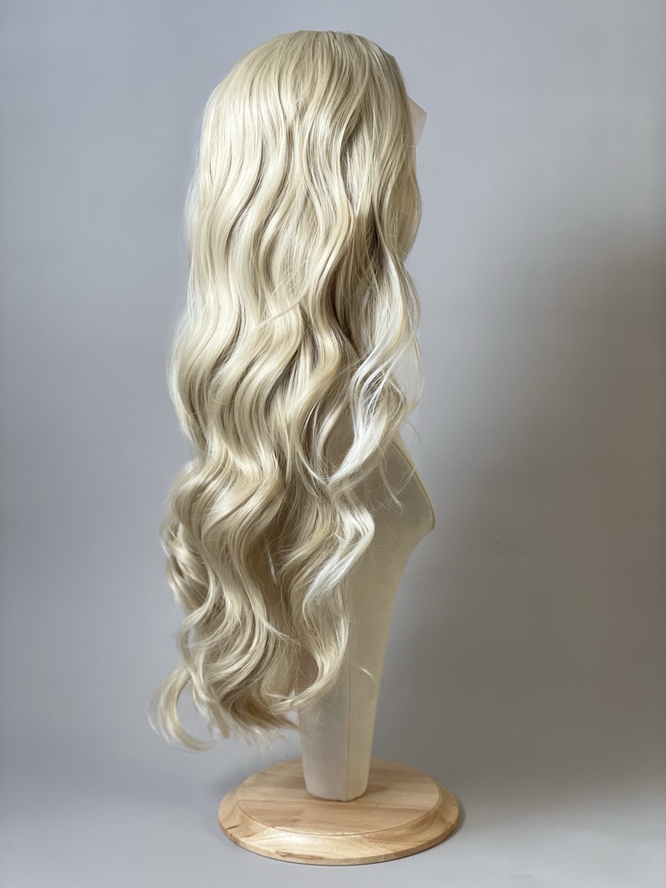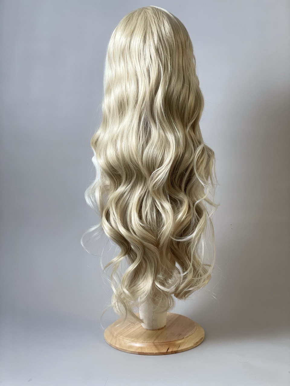 Perruque blond très clair beige légèrement ondulée. Un dégradé de blond qui finit finit en blond platine .