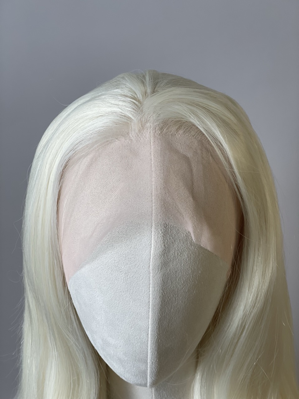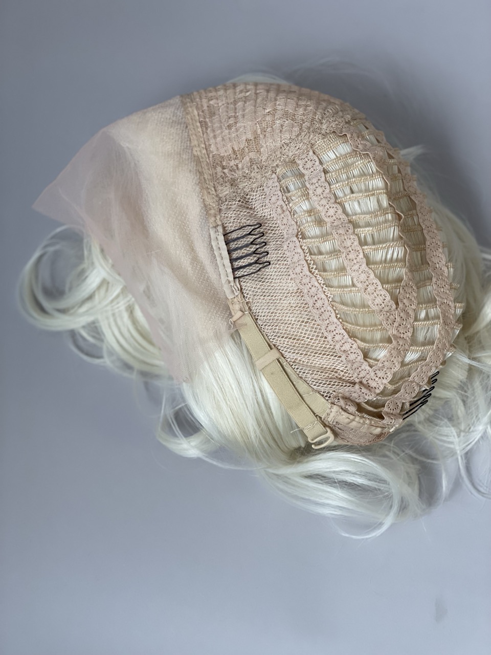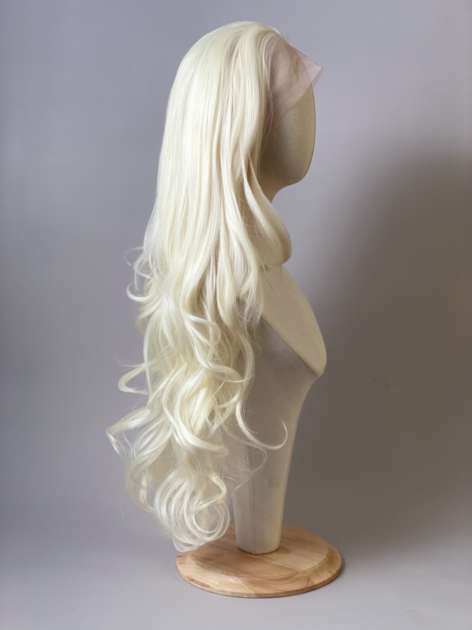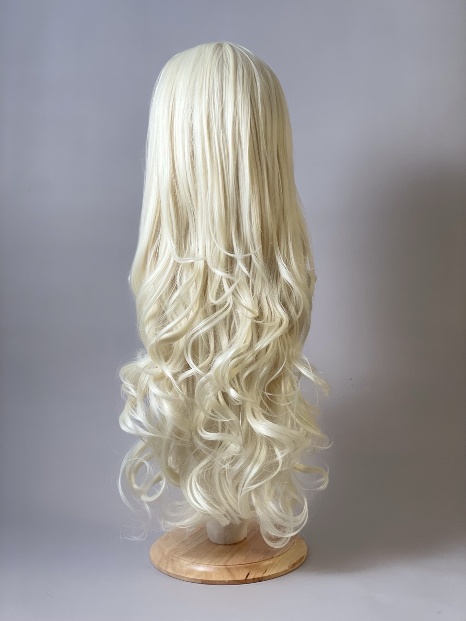 Perruque platine dorée légèrement ondulée. Un dégradé met en valeur ses ondulations.