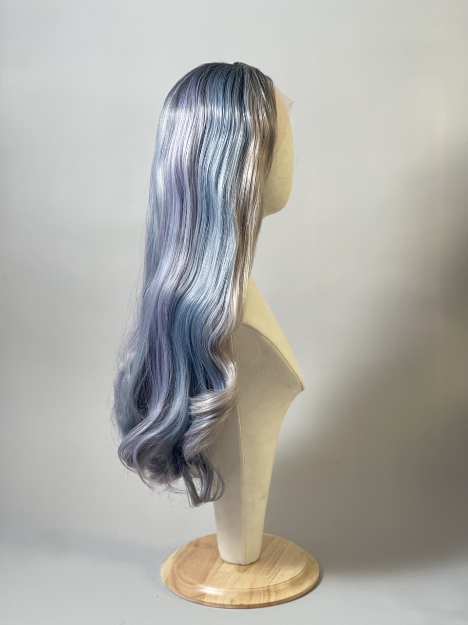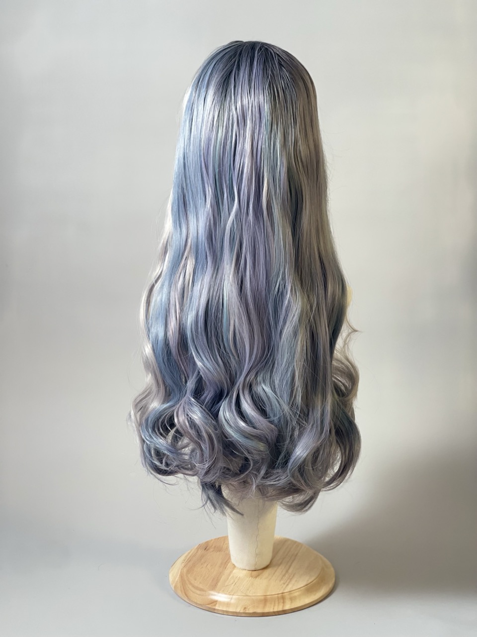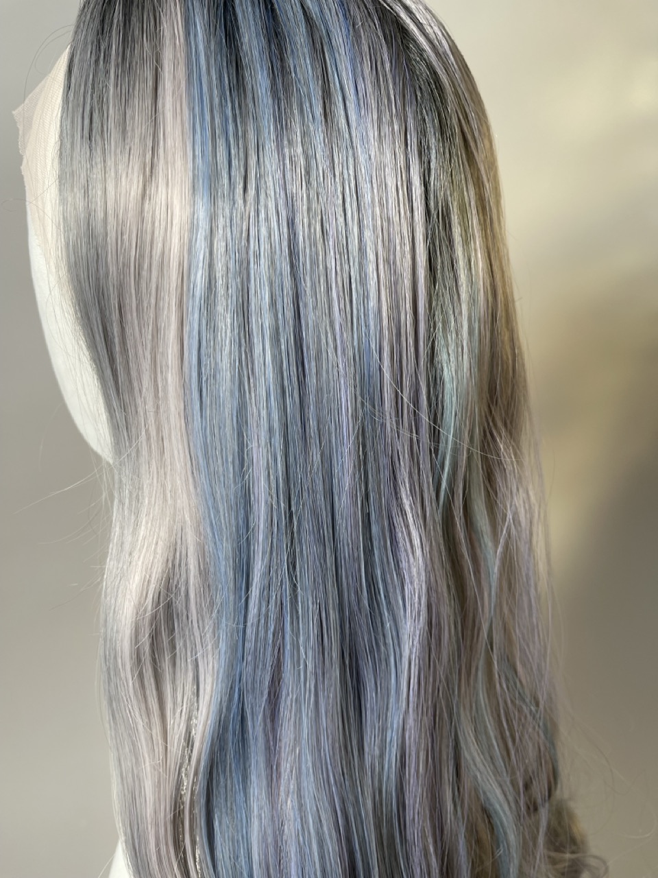 Perruque longue grise avec touches de bleu pastel et vieux rose