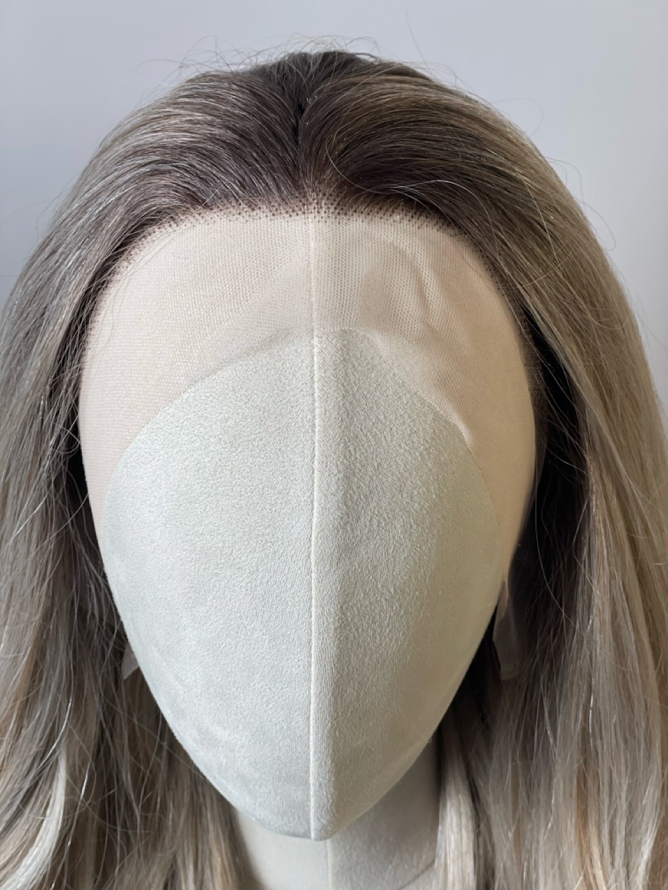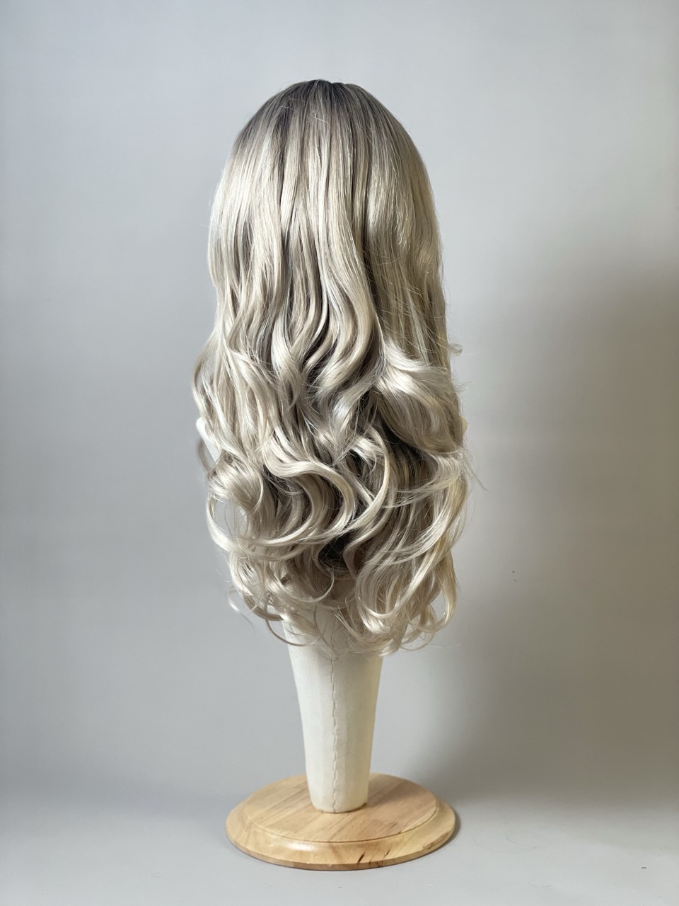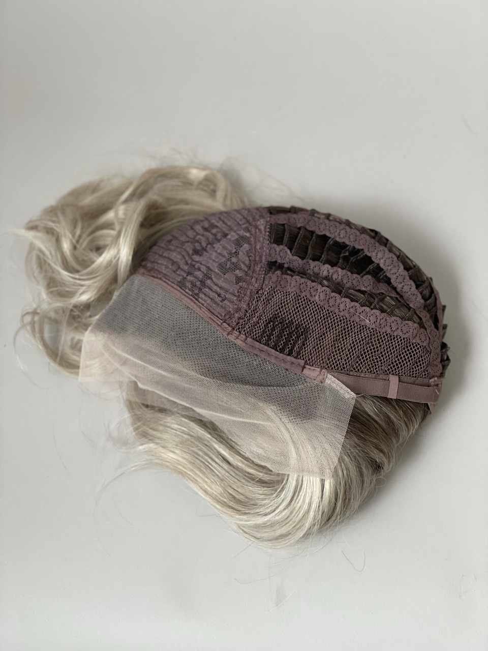 Perruque blond beige légèrement ondulée. Un subtile mélange de 3 blond différents lui apportant un effet glacé très naturel.