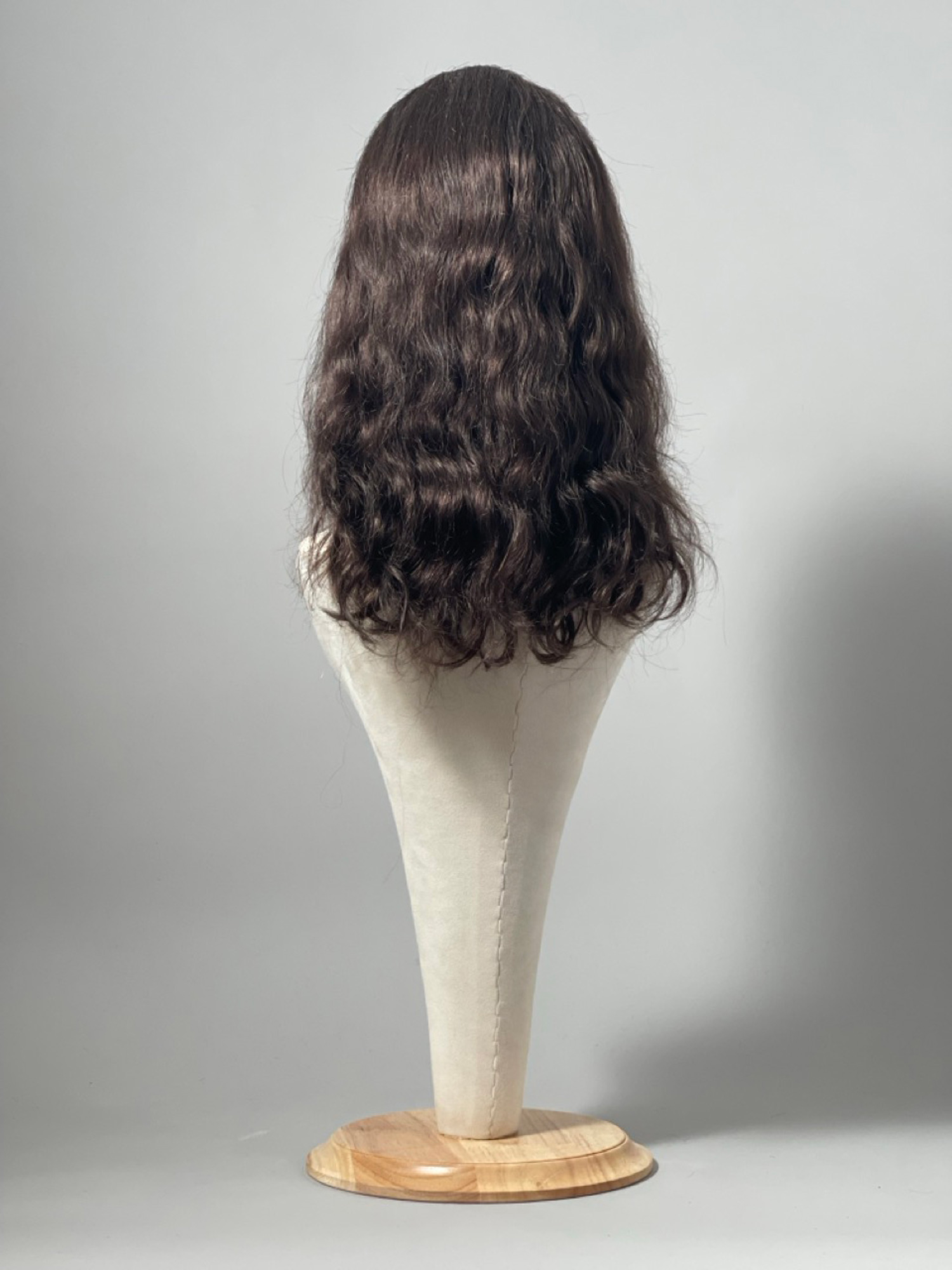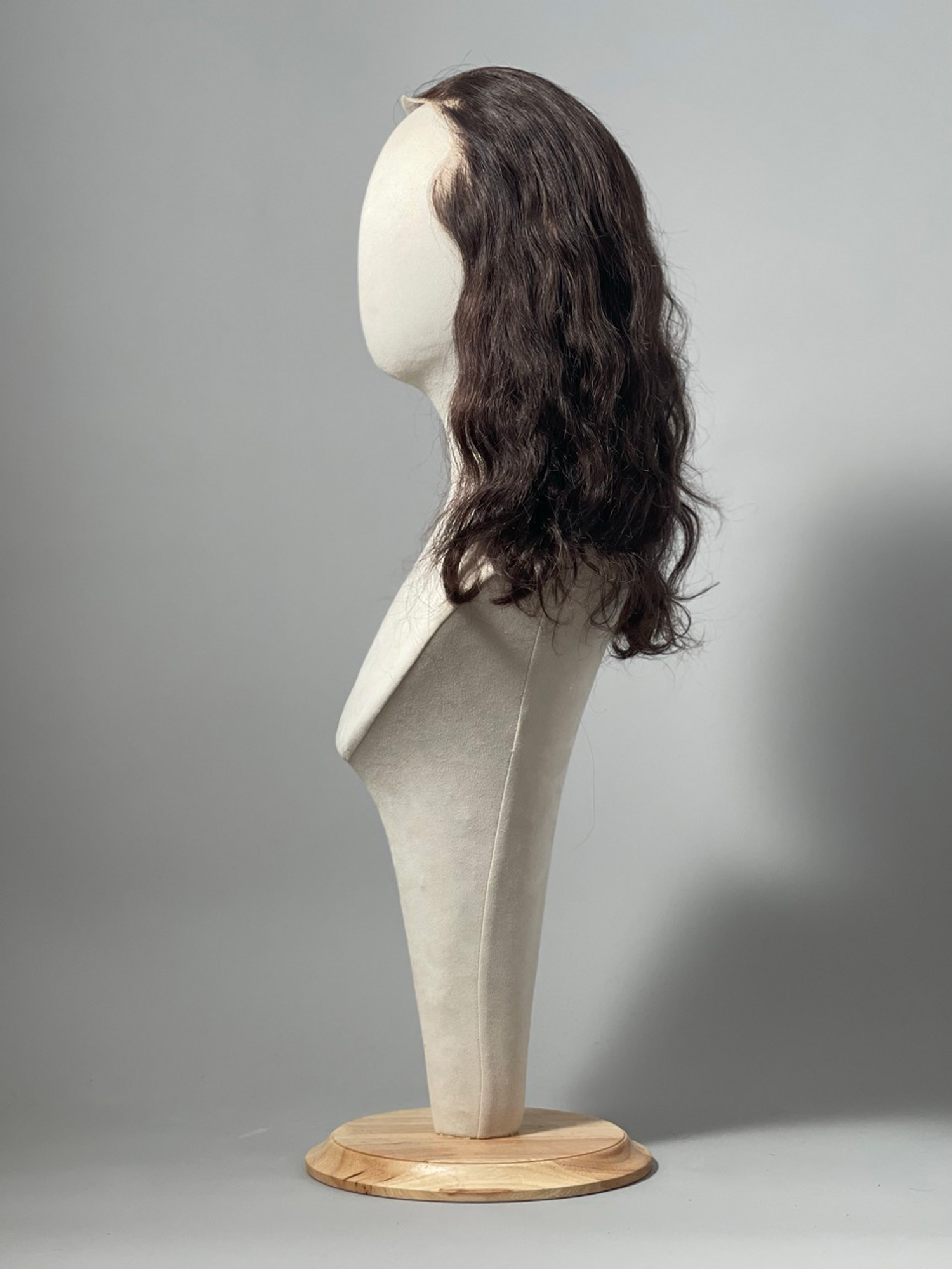Cap design: Tulle théâtre sur la partie frontale implantée à la main en simple noeud et tresses cousues à l’arrière.