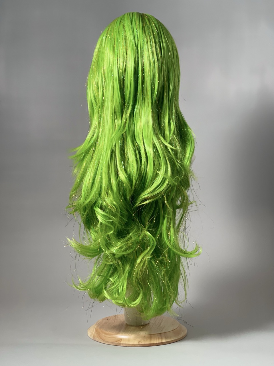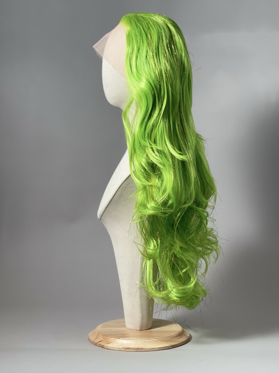 Perruque longue dégradée sublimée par des fibres pailletées (Tinsel) dans une joyeuse couleur verte citronnée.