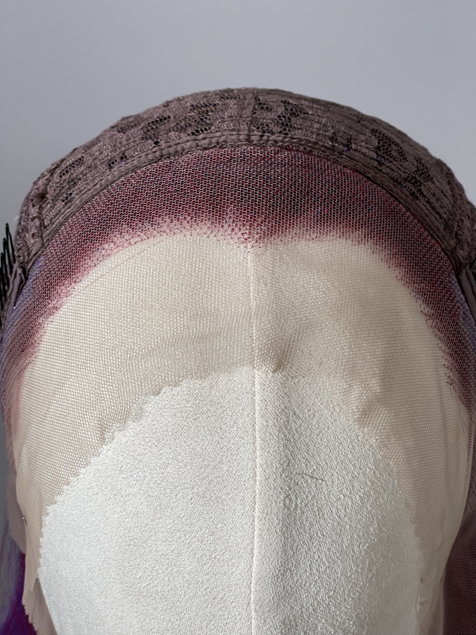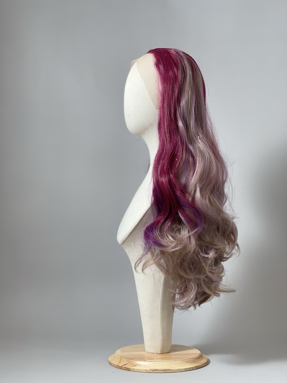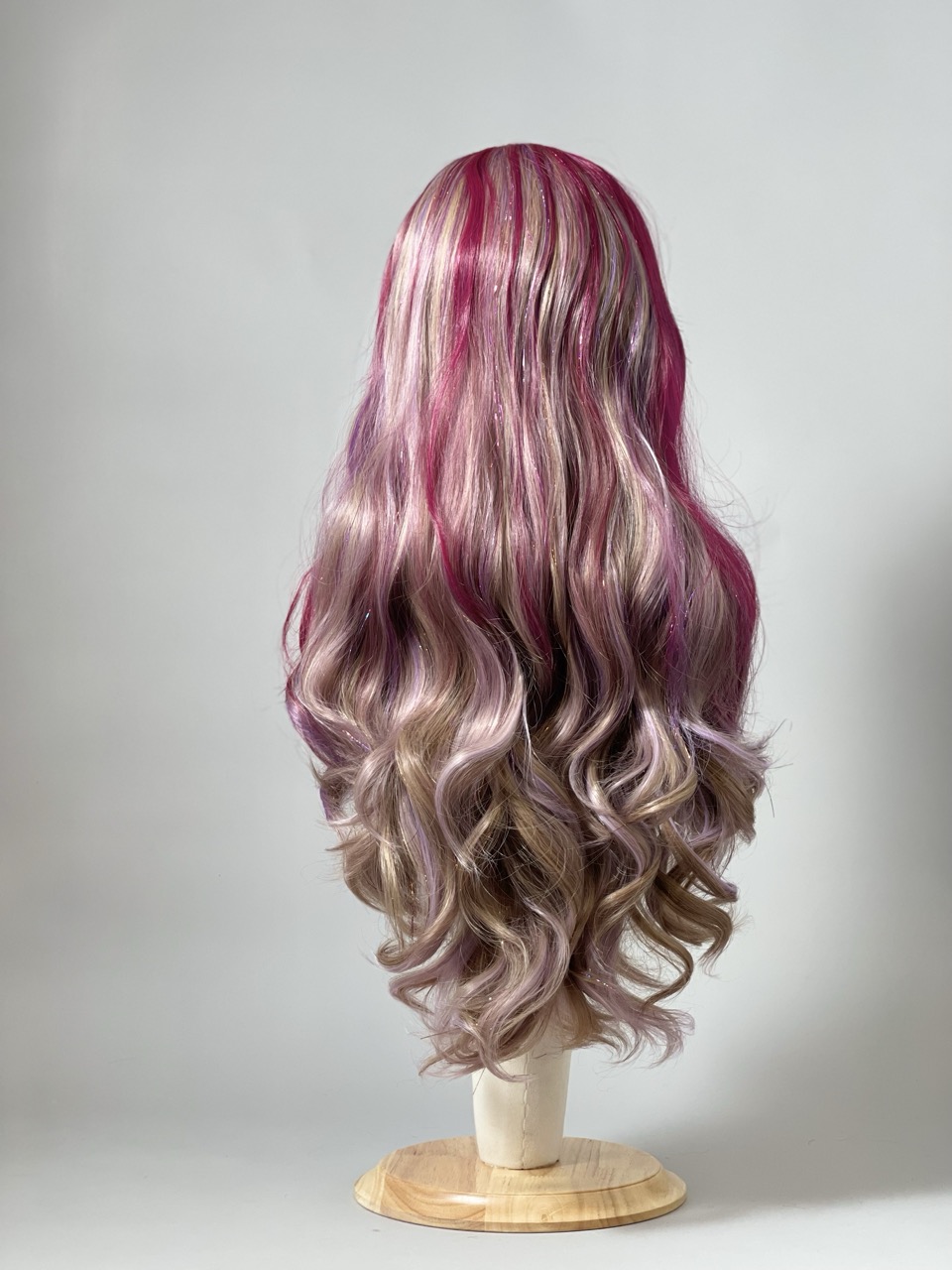 Perruque longue dégradée déclinée en plusieurs mélanges subtiles de violet et de rose, le tout sublimé par des fibres pailletées