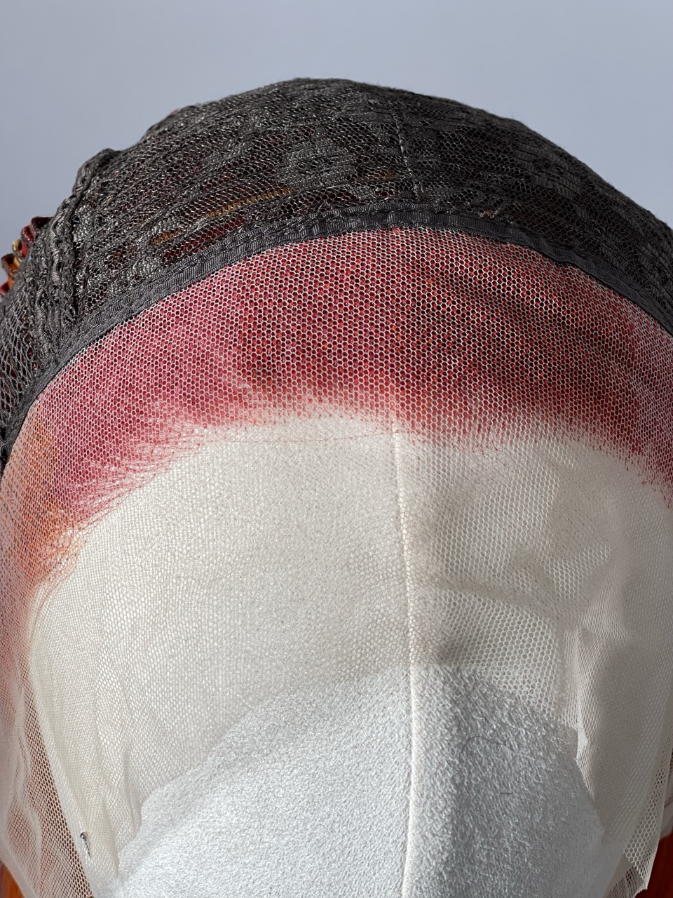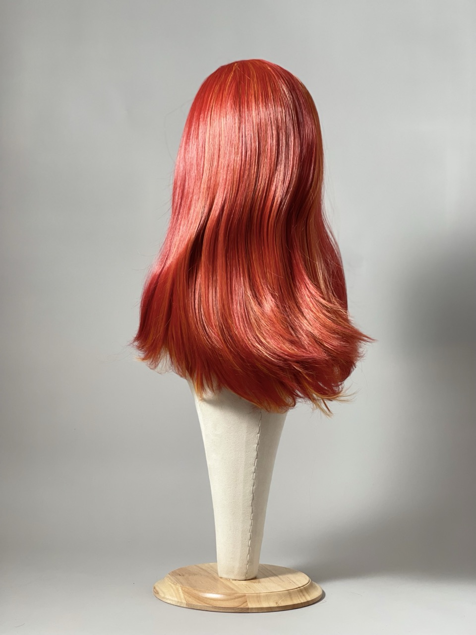 Perruque Carré dégradé épaule rouge subtilement nuancé d’orange et de rose.